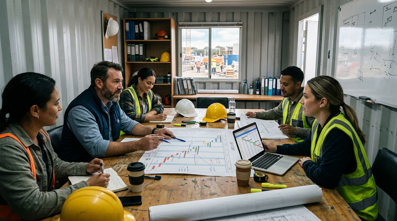 Custom new builds (Open) — from design development through envelope and services on site. Renovations & extensions (Open) — existing structure, moisture paths, and live-in construction. Land & townhomes (Open) — staging, interface matrices, and multi-dwelling coordination. Project management (Open) — tender, contract, and site coordination when engaged by the owner.